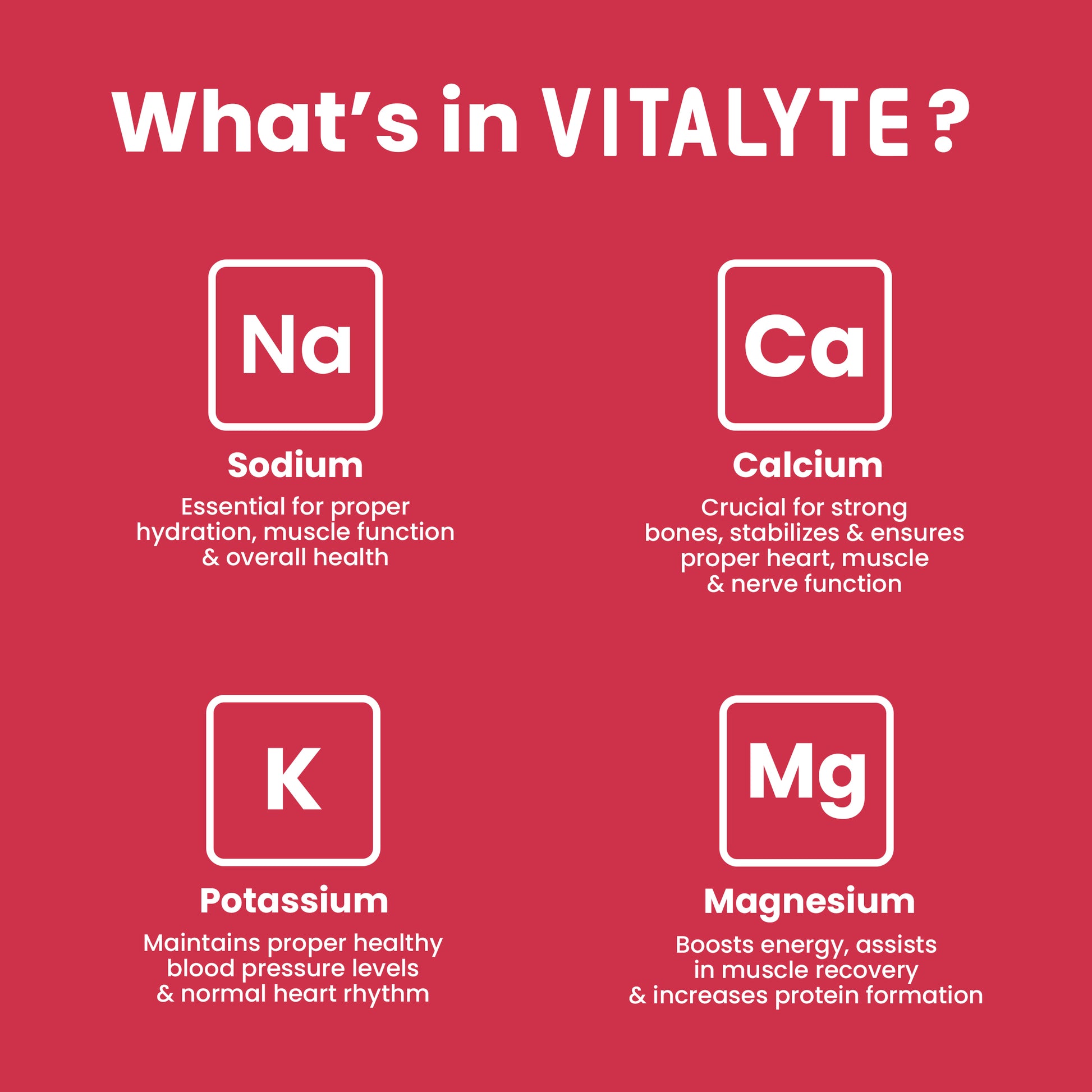 Sodium, potassium, calcium, and magnesium are the four core electrolytes found in our products. We've done the math for the perfect balance of sodium and potassium (the first minerals lost through sweat and fluids) in order to replenish and hydrate as fast as possible. Fun fact: Vitalyte has the same sodium/potassium balance as an IV!