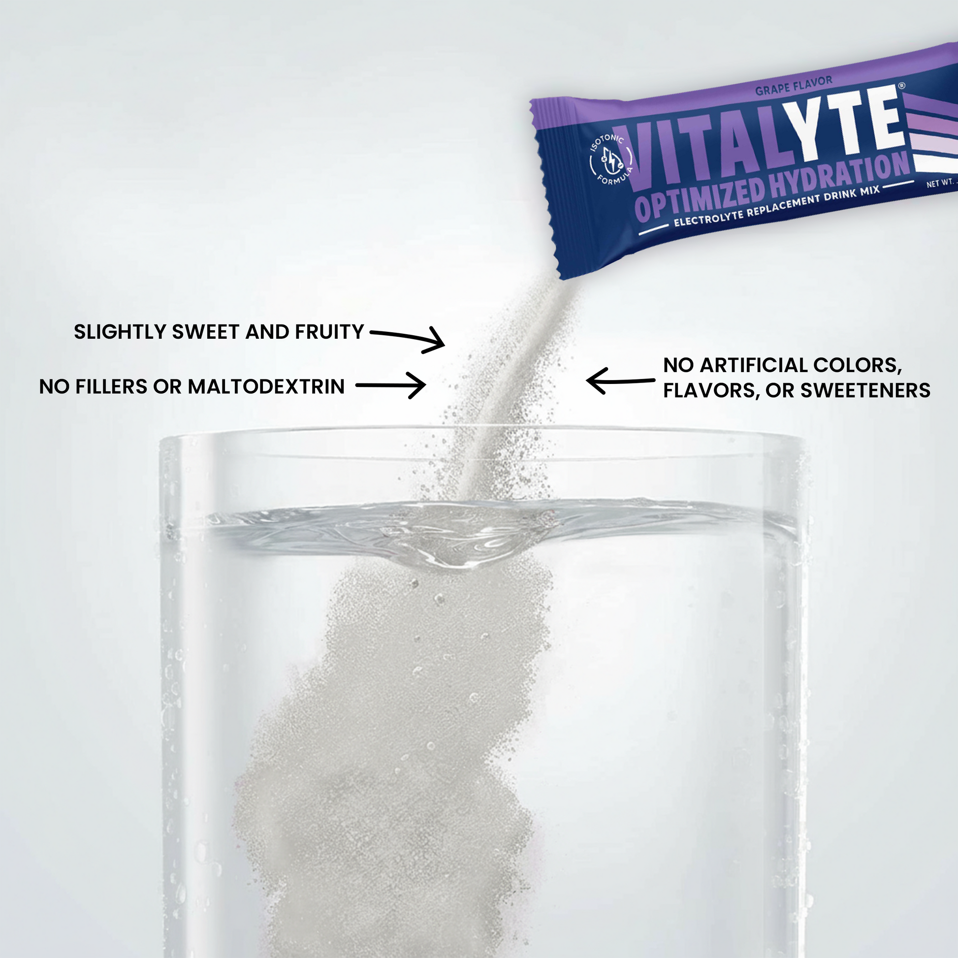 When two solutions have the same osmotic pressure they are considered isotonic. Our formula contains the ideal balance of sodium and potassium that matches those found in your blood, resulting in faster hydration. This means 8 oz. of Vitalyte gets absorbed within 2 minutes, faster than any other electrolyte replacement drink on the market!