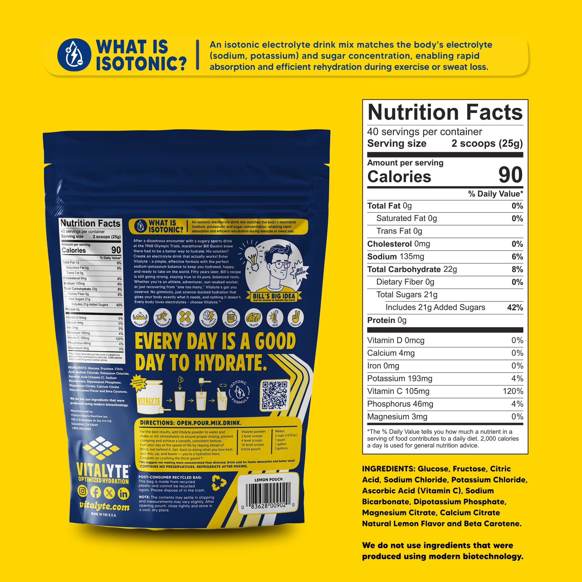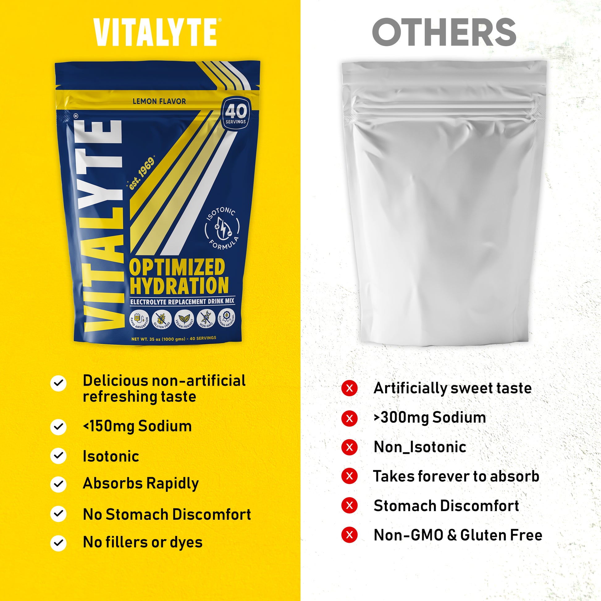 When two solutions have the same osmotic pressure they are considered isotonic. Our formula contains the ideal balance of sodium and potassium that matches those found in your blood, resulting in faster hydration. This means 8 oz. of Vitalyte gets absorbed within 2 minutes, faster than any other electrolyte replacement drink on the market!