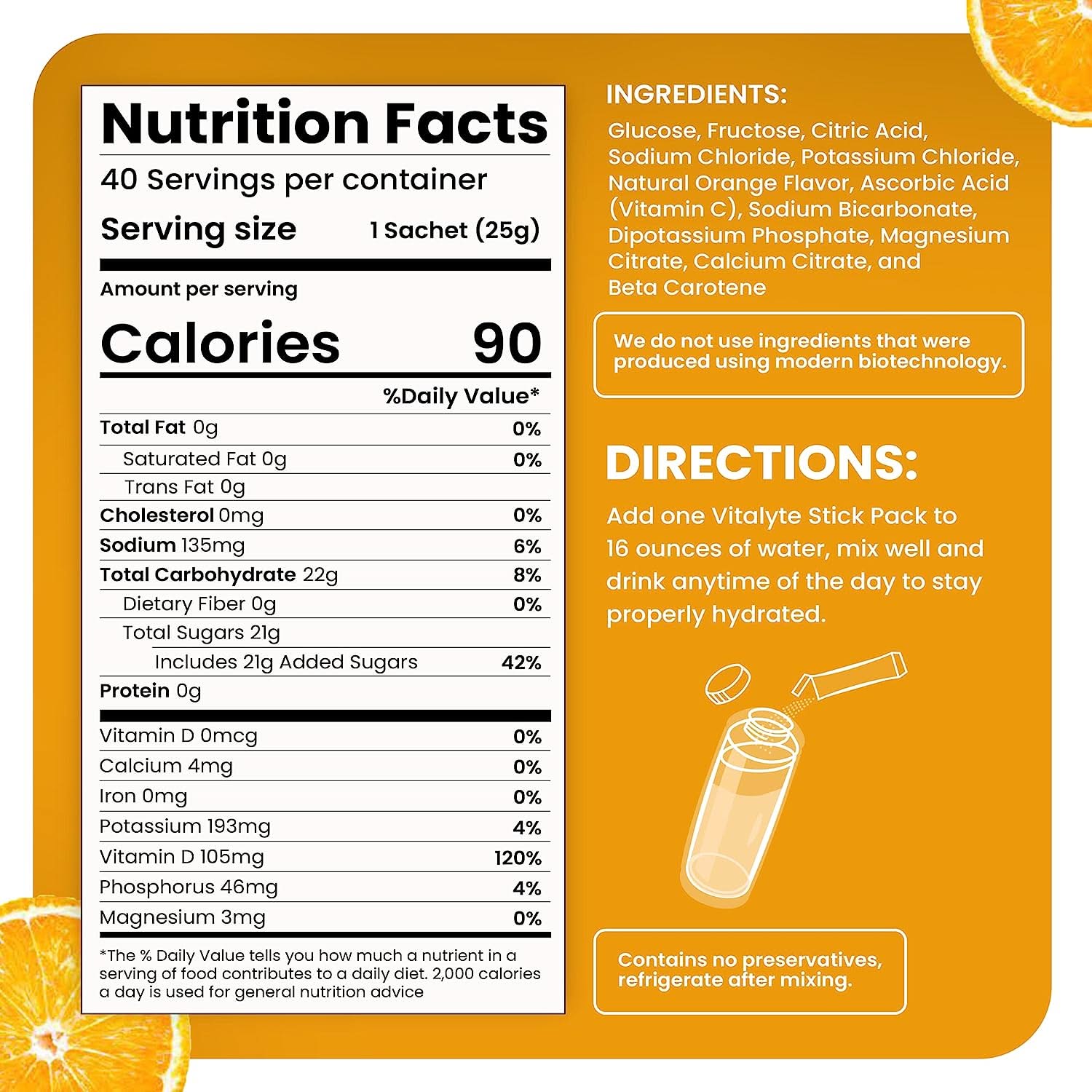 Glucose, Fructose, Citric Acid, Sodium Chloride, Potassium Chloride, Natural Orange Flavor, Ascorbic Acid (Vitamin C), Sodium Bicarbonate, Dipotassium Phosphate, Magnesium Citrate, Calcium Citrate, and Beta Carotene